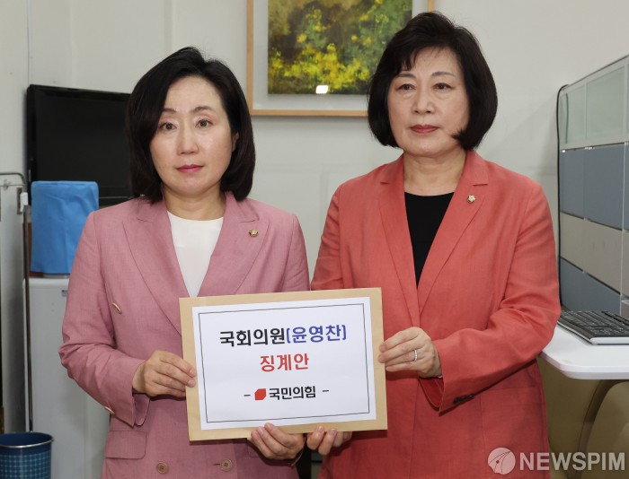 [서울=뉴스핌] 이형석 기자 = 정경희 국민의힘 원내부대표와 전주혜 원내대변인이 4일 서울 여의도 국회 의안과에 윤영찬 더불어민주당 의원 징계안을 제출하고 있다. 2023.07.04 leehs@newspim.com