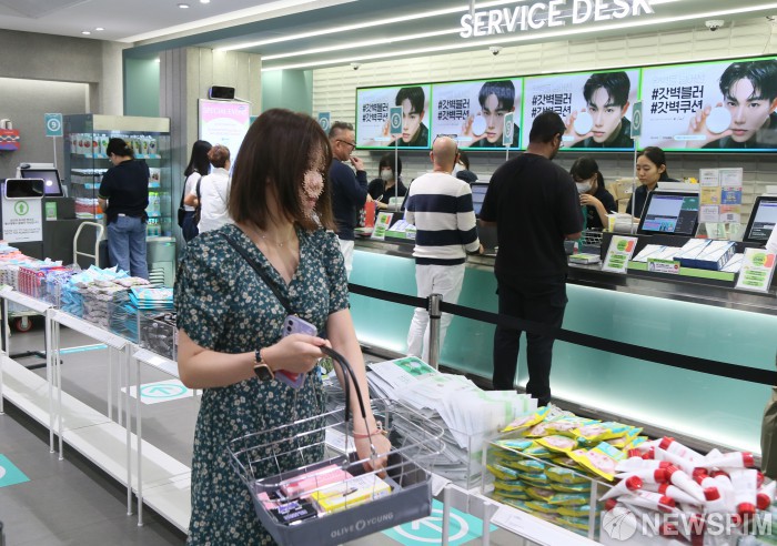 [서울=뉴스핌] 양윤모 기자 = 코로나 앤데믹이후 최근 1년새 방한 관광객 5배 늘었다는 통계가 발표된 4일 서울 명동을 찾은 동남아 관광객등 외국관광객들이 명동'올리브영'매장에서 쇼핑바구니를 들고 화장품과 다얄한 제품의 쇼핑을 즐기고 있다. 2023.07.04yym58@newspim.com