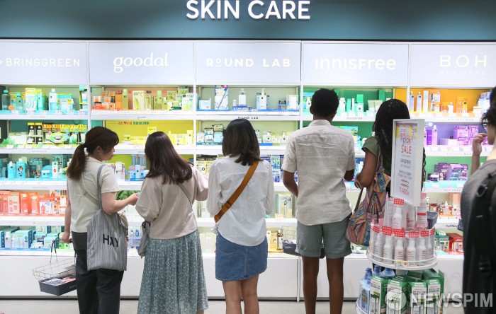 [서울=뉴스핌] 양윤모 기자 = 코로나 앤데믹이후 최근 1년새 방한 관광객 5배 늘었다는 통계가 발표된 4일 서울 명동을 찾은 동남아 관광객등 외국관광객들이 명동'올리브영'매장에서 쇼핑바구니를 들고 화장품과 다얄한 제품의 쇼핑을 즐기고 있다. 2023.07.04yym58@newspim.com