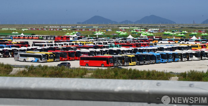 [부안=뉴스핌] 윤창빈 기자 = 8일 오후 전북 부안군 잼버리 대회장에서 새만금 세계스카우트잼버리에 참가한 각국 대원들을 태우기 위해 버스가 대기하고 있다. 기록적인 폭염과 북상하고 있는 태풍 ‘카눈’의 영향으로 세계스카우트연맹은 잼버리 조기 철수를 결정했다. 2023.08.08 pangbin@newspim.com
