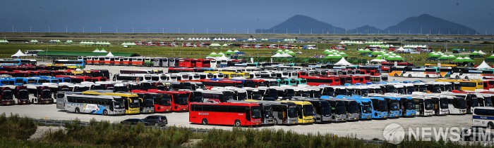 [부안=뉴스핌] 윤창빈 기자 = 8일 오후 전북 부안군 잼버리 대회장에서 새만금 세계스카우트잼버리에 참가한 각국 대원들을 태우기 위해 버스가 대기하고 있다. 기록적인 폭염과 북상하고 있는 태풍 '카눈'의 영향으로 세계스카우트연맹은 잼버리 조기 철수를 결정했다. 2023.08.08 pangbin@newspim.com