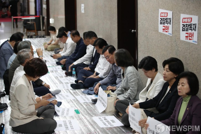 [서울=뉴스핌] 윤창빈 기자 = 이재명 더불어민주당 대표 단식 16일차인 15일 오후 서울 여의도 국회 민주당 대표실 앞에서 남인순 의원을 비롯한 의원들이 단식중단을 호소하고 있다. 2023.09.15 pangbin@newspim.com
