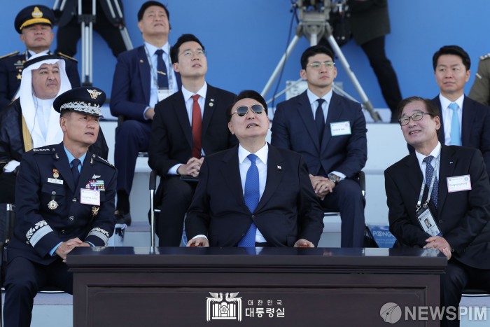 [서울=뉴스핌] 윤석열 대통령이 17일 경기도 성남 서울공항에서 열린 '서울 아덱스(ADEX) 2023' 개막식에서 축하비행을 관람하며 박수치고 있다.[사진=대통령실] 2023.10.17 photo@newspim.com