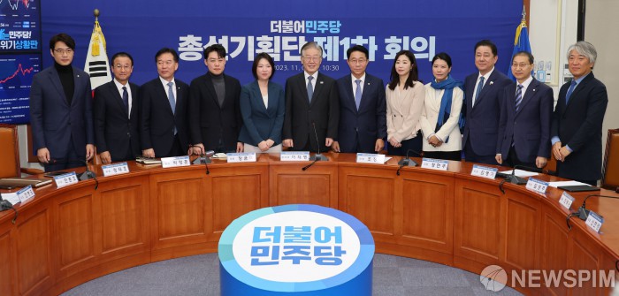 [서울=뉴스핌] 이형석 기자 = 이재명 더불어민주당 대표와 위원들이 6일 오전 서울 여의도 국회에서 열린 총선기획단 1차 회의에서 기념촬영을 하고 있다. 2023.11.06 leehs@newspim.com