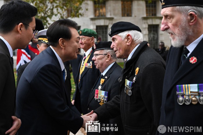 [서울=뉴스핌]윤석열 대통령이 21일(현지시간) 런던 한국전 참전 기념비에서 영국군 한국전 참전용사들과 인사하고 있다.[사진=대통령실] 2023.11.22 photo@newspim.com