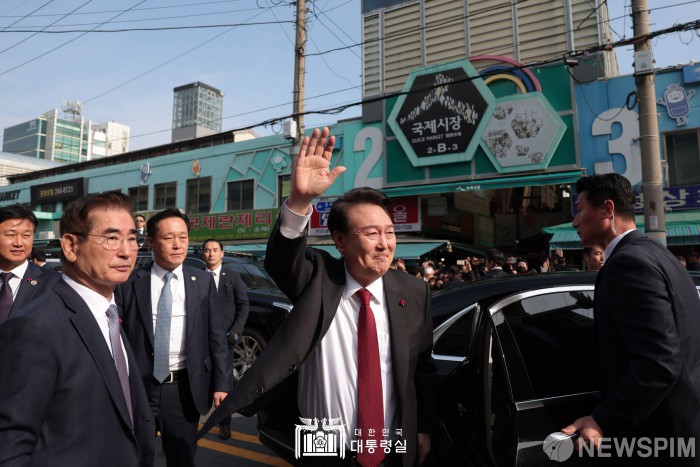 [서울=뉴스핌]윤석열 대통령이 6일 부산 중구 깡통시장을 방문해 시민들의 환호에 손들어 인사하고 있다. [사진=대통령실] 2023.12.06 photo@newspim.com