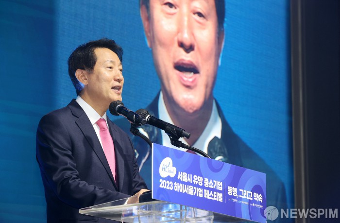 [서울=뉴스핌] 정일구 기자 = 오세훈 서울시장이 7일 오후 서울 여의도 페어몬트 앰배서더 서울에서 열린 서울시 유망 중소기업 '2023 하이서울기업 페스티벌'에서 축사를 하고 있다. 2023.12.07 mironj19@newspim.com