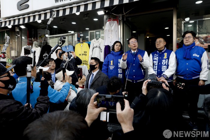 [인천=뉴스핌] 이형석 기자 = 이재명 더불어민주당 대표가 인천 미추홀구 신기시장을 찾아 발언을 하고 있다. 2024.03.20 leehs@newspim.com