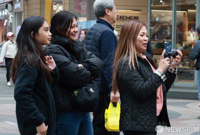 [서울=뉴스핌] 양윤모 기자 = 22일 오후 서울의 낮기온이 14도를 나타내는 가운데 금요일을 맞아 명동을 찾은 많은 관광객들이 추억을 만들고 있다. 2024.03.22 yym58@newspim.com