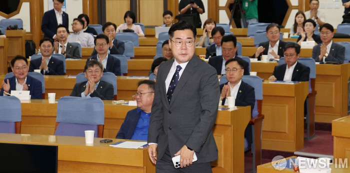 [서울=뉴스핌] 이형석 기자 = 박찬대 더불어민주당 당대표 직무대행 겸 원내대표가 6일 오전 서울 여의도 국회 의원회관에서 열린 ‘경제는 민주당 출범식’에서 인사말을 위해 이동하고 있다. 2024.08.06 leehs@newspim.com