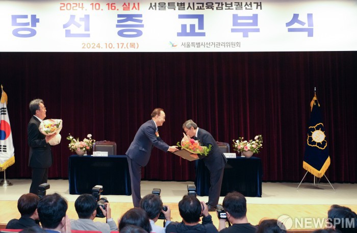 [서울=뉴스핌] 최지환 기자 = 정근식 서울시교육감 당선인이 17일 오전 서울 종로구 서울특별시선거관리위원회에서 열린 당선증 교부식에서 김정중 서울시선거관리위원장에게 당선증을 받고 있다. 2024.10.17 choipix16@newspim.com