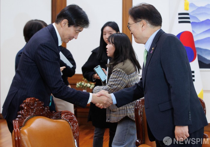 [서울=뉴스핌] 윤창빈 기자 = 우원식 국회의장, 조국 조국혁신당 대표가 4일 오후 서울 여의도 국회 의장실에서 긴급 회동을 열고 악수를 하고 있다. 2024.12.04 pangbin@newspim.com