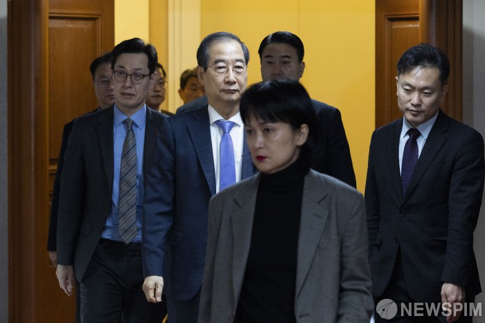 [서울=뉴스핌] 이호형 기자 = 한덕수 국무총리가 8일 오후 서울 종로구 정부서울청사에서 열린 국무위원 간담회를 마치고 회의실에서 나오고 있다. 2024.12.08 leemario@newspim.com