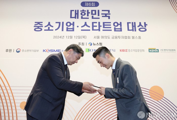 [서울=뉴스핌] 정일구 기자 = 조진형 중소기업중앙회 상근이사가 12일 오전 서울 여의도 금융투자협회에서 뉴스핌 주최로 열린 '제6회 대한민국 중소기업·스타트업 대상'에서 이찬 플로틱 대표에게 중소기업중앙회 회장상을 시상하고 있다. 2024.12.12 mironj19@newspim.com