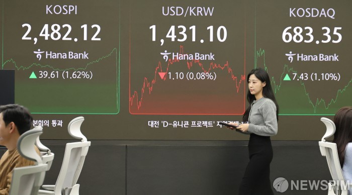 [서울=뉴스핌] 양윤모 기자 = 윤석열 대통령이 12일 오전 네 번째 대국민 담화를 발표한 가운데, 오후 3시 30분 코스피지수가 전 거래일 종가보다 39.61포인트(1.62%) 상승한 2,482.12로, 코스닥지수는 7.43포인트(1.10%) 상승한 683.35로 오후 거래를 마감했다. 서울 외환시장에서 달러/원 환율은 전 거래일보다 1.00원(-0.07%) 하락한 1,431.20원에 오후 거래를 마감한 가운데, 서울 중구 하나은행 딜링룸에서 직원들이 업무를 보고 있다. 2024.12.12 yym58@newspim.com