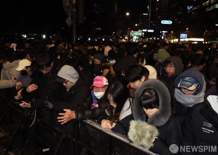 [서울=뉴스핌] 이호형 기자 = 무안 제주항공기 참사 ‘국가 애도 기간’ 속에 2024년 제야의 종 타종행사가 열린 31일 오후 서울 종로구 보신각에서 참석한 시민들이 애도 묵념을 하고 있다. 2024.12.31 leemario@newspim.com