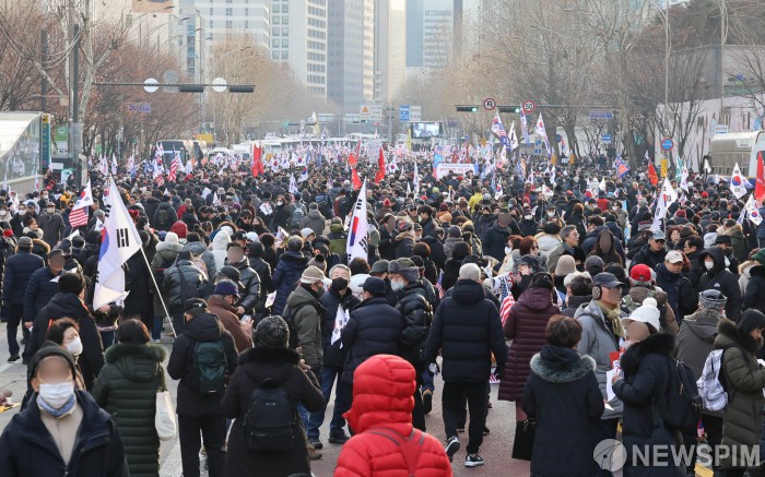 [서울=뉴스핌] 양윤모 기자 = 12·3 비상계엄 선포로 '내란 수괴(우두머리)' 혐의로 고위공직자범죄수사처에 체포된 윤석열 대통령이 18일 오후 2시 서울서부지방법원에서 열리는 구속 전 피의자 심문(영장실질심사)에 출석한 가운데, 윤 대통령의 구속을 반대하는 지지자들이 법원 앞 도로에서 집회를 하고 있다. 2025.01.18 yym58@newspim.com