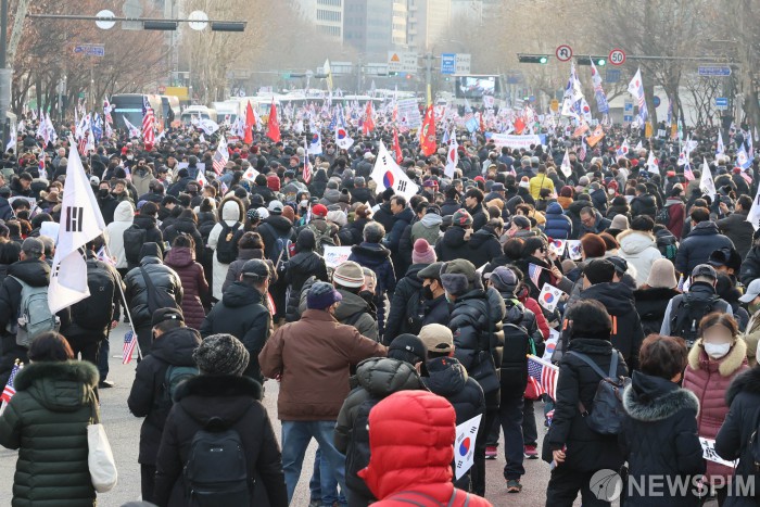 [서울=뉴스핌] 양윤모 기자 = 12·3 비상계엄 선포로 '내란 수괴(우두머리)' 혐의로 고위공직자범죄수사처에 체포된 윤석열 대통령이 18일 오후 2시 서울서부지방법원에서 열리는 구속 전 피의자 심문(영장실질심사)에 출석한 가운데, 윤 대통령의 구속을 반대하는 지지자들이 법원 앞 도로에서 집회를 하고 있다. 2025.01.18 yym58@newspim.com