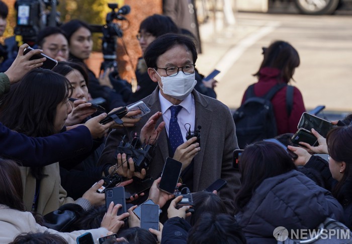 [서울=뉴스핌] 사진공동취재단 = 윤석열 대통령 측 변호인단에 속해 있는 배진한 변호사가 23일 오후 서울 종로구 헌법재판소에서 열린 윤 대통령 탄핵심판 4차 변론기일에 참석하며 취재진의 질문에 답하고 있다. 2025.01.23 photo@newspim.com
