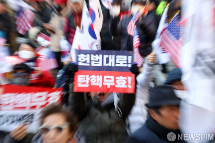 [서울=뉴스핌] 사진공동취재단 = 윤석열 대통령 탄핵 심판 4차 변론기일인 23일 오후 서울 종로구 헌법재판소 인근에서 윤석열 대통령이 헌재에 출석한 가운데 윤 대통령을 지지하는 보수단체 집회가 열리고 있다. 2025.01.23 photo@newspim.com