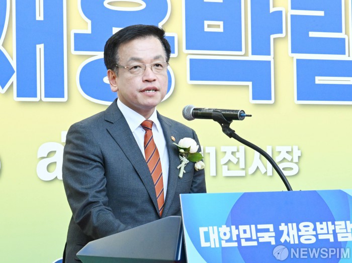 [서울=뉴스핌] 최상목 대통령 권한대행 부총리 겸 기획재정부 장관이 19일서울 서초구 aT센터 전시장에서 열린 '2025 대한민국 채용박람회'에서 개회사를 하고 있다.[사진=기획재정부] 2025.03.19 photo@newspim.com