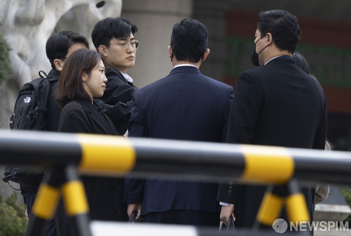 [서울=뉴스핌] 양윤모 기자 = 윤석열 대통령에 대한 체포영장 집행을 방해한 혐의를 받는 김성훈 대통령경호처 차장이 21일 오전 구속 전 피의자 심문(영장실질심사)을 받기위해 서울서부지법에 출석하며 취재진의 질문에 답하고 있다. [공동취재] 2025.03.21 yym58@newspim.com