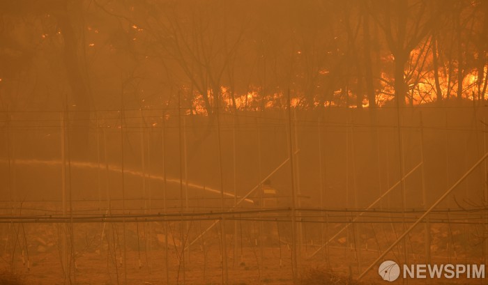 [안동=뉴스핌] 정일구 기자 = 경북 의성에서 시작된 산불이 안동으로 번진 가운데 25일 오후 경북 안동시 길안면 백자리에서 소방대원이 크게 확산된 산불을 진화하고 있다. 2025.03.25 mironj19@newspim.com