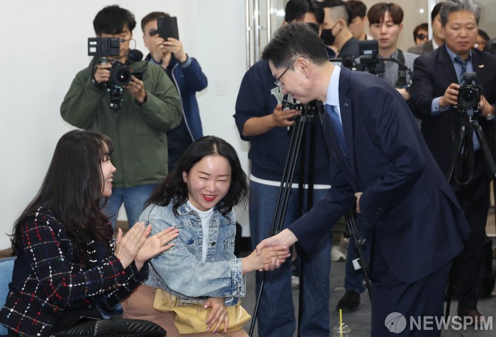 [고양=뉴스핌] 김학선 기자 = 더불어민주당 대선 경선에 출마한 김경수 전 경남지사가 15일 경기도 고양시의 한 공실 상가에서 열린 민생경제 회복을 위한 자영업자 간담회에서 참석자들과 인사를 나누고 있다. 2025.04.15 yooksa@newspim.com
