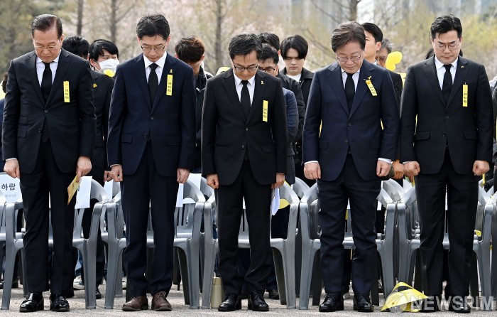 [안산=뉴스핌] 김학선 기자 = 권영세 국민의힘 비상대책위원장(왼쪽부터), 김경수 전 경남지사, 김동연 경기지사, 이재명 더불어민주당 전 대표, 박찬대 당대표 권한대행 겸 원내대표 등 참석자들이 16일 오후 경기도 안산시 화랑유원지에서 열린 세월호 참사 11주기 기억식에서 304명 희생자에 대한 묵념을 하고 있다. 2025.04.16 yooksa@newspim.com
