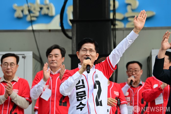 [부산=뉴스핌] 최지환 기자 = 김문수 국민의힘 대선 후보가 13일 부산 중구 자갈치시장에서 유세를 하며 지지를 호소하고 있다. 2025.05.13 choipix16@newspim.com