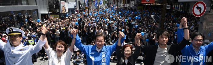 [부산=뉴스핌] 정일구 기자 = 이재명 더불어민주당 대선후보가 14일 부산 서면에서 열린 집중 유세에서 부산 시민 대표들과 손을 맞잡아 들고 있다. 2025.05.14 mironj19@newspim.com
