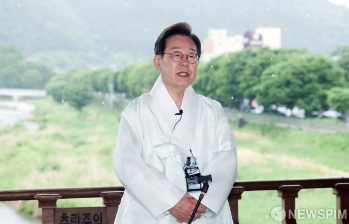 [전주=뉴스핌] 김학선 기자 = 이재명 더불어민주당 대선 후보가 16일 오후 전북특별자치도 전주시 와산구 청연루에서 K-컬처 ‘전통의 소리를 잇다-청년 국악인과의 간담회‘를 마친 뒤 취재진과 백브리핑을 하고 있다. 2025.05.16 yooksa@newspim.com