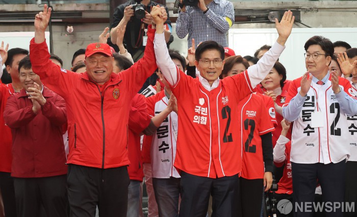 [서울=뉴스핌] 최지환 기자 = 김문수 국민의힘 대선 후보가 19일 오후 서울 중구 서울역 광장에서 열린 ‘쏘울을 새롭게’ 유세에서 가수 김흥국과 함께 유권자들에게 손을 들어보이며 인사하고 있다. 2025.5.19 choipix16@newspim.com
