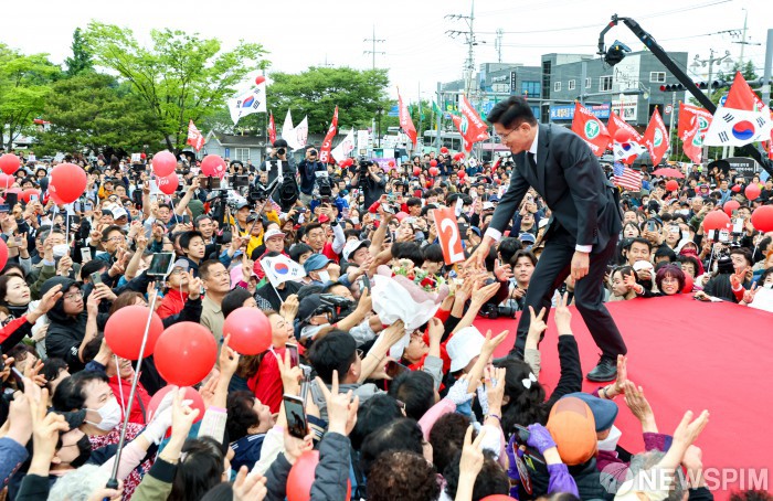[구미=뉴스핌] 정일구 기자 = 김문수 국민의힘 대선 후보가 24일 오후 오후 경북 구미시 박정희 전 대통령 생가 앞에서 열린 "대한민국 기적의 시작" 구미시 집중유세에서 시민들에게 인사하고 있다. 2025.05.24 mironj19@newspim.com