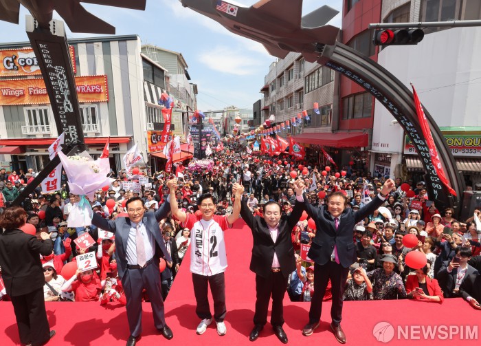 [평택=뉴스핌] 최지환 기자 = 김문수 국민의힘 대선후보가 26일 오후 경기 평택시 미군기지 정문 앞에서 열린 유세현장에서 전임 경기도지사와 함께 지지를 호소하고 있다. 왼쪽부터 임창열, 김 후보, 손학규, 전 지사. 2025.05.26 choipix16@newspim.com