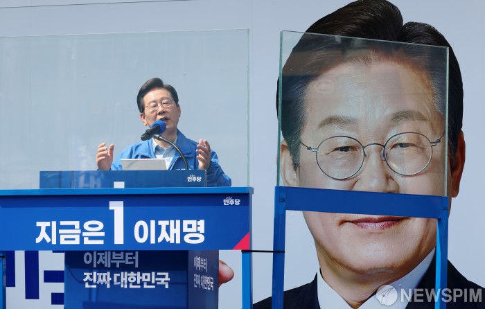 [용인=뉴스핌] 정일구 기자 = 이재명 더불어민주당 대선 후보가 26일 오후 경기 용인시 단국대 죽전캠퍼스 정문 앞에서 열린 용인 유세에서 연설을 하고 있다. 2025.05.26 mironj19@newspim.com