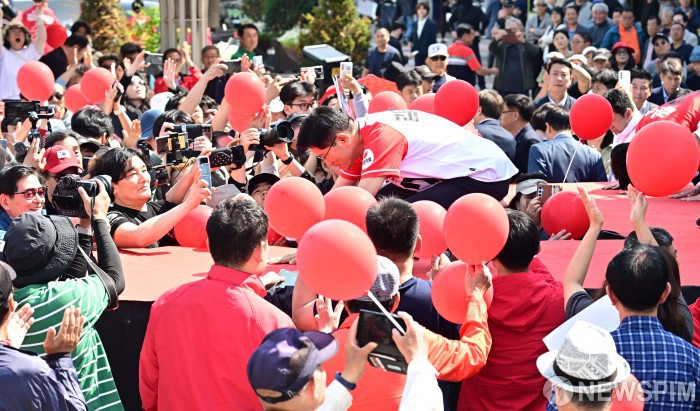 [오산=뉴스핌] 최지환 기자 = 김문수 국민의힘 대통령 후보가 26일 오후 경기도 오산시 오산역광장에서 열린 유세에서 큰절을 하고 있다. 2025.05.26 choipix16@newspim.com