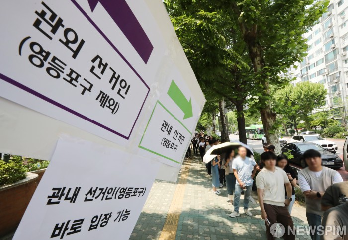 [서울=뉴스핌] 이형석 기자 = 제21대 대통령 선거 사전투표가 시작된 29일 오후 서울 여의도 투표소에 시민들이 투표를 위해 줄을 서 있다. 2025.05.29 leehs@newspim.com