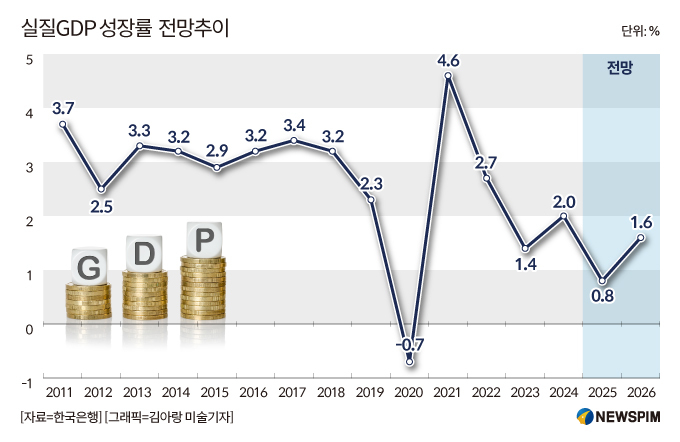 한은은 이날 올해 성장률 전망을 지난 2월 1.5%에서 0.8%로 낮췄다. 이 같은 성장률은 코로나19시기였던 2020년 -0.7%의 이례적인 역성장 이후 가장 낮은 0%대 성장이다.