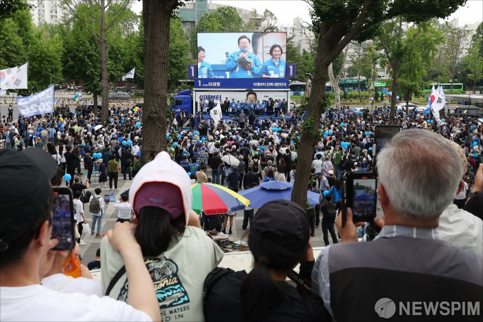 [서울=뉴스핌] 정일구 기자 = 이재명 더불어민주당 대선 후보가 29일 오후 서울 송파구 잠실야구장 앞에서 선거유세를 하고 있다. 2025.05.29 mironj19@newspim.com