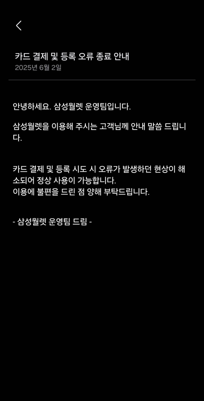삼성전자는 이날 9시쯤 삼성월렛 애플리케이션 공지사항에 '카드 결제 및 등록 오류 발생 안내'란 제목의 공지글을 뒤늦게 올렸다. 해당 글에는 "카드 결제 및 등록 시도 시 오류가 발생하고 있다"며 "현재 원인을 파악하고 있으며, 조속히 정상화될 수 있도록 노력하겠다"는 내용이 담겼다.