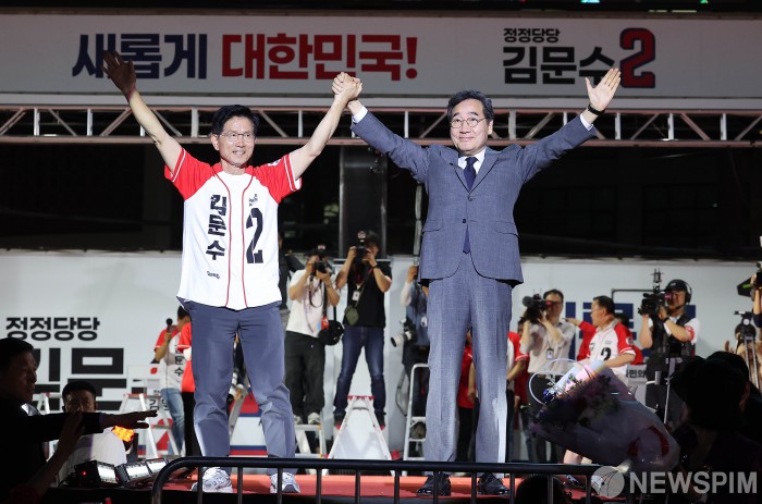 [서울=뉴스핌] 윤창빈 기자 = 김문수 국민의힘 대선 후보가 2일 오후 서울 중구 서울광장에서 열린 피날레 유세에서 이낙연 전 총리와 함께 인사를 하고 있다. 2025.06.02 pangbin@newspim.com