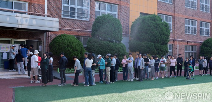 [서울=뉴스핌] 이길동 기자 = 21대 대통령선거 투표일인 3일 오전 서울 서초구 원명초등학교에 마련된 서초4동 제3투표소에 투표하려는 시민들로 붐비고 있다.2025.06.03.gdlee@newspim.com