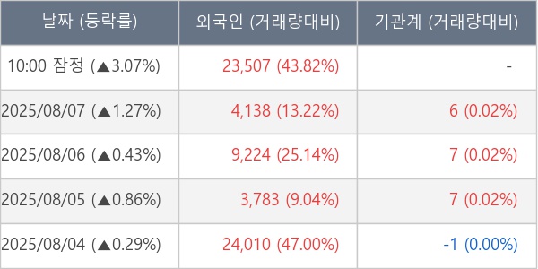 [서울=뉴스핌] 로보뉴스 = 08일 10시 15분 현재 특수건설(026150)은 전일 대비 3.07% (현재가 7,390원) 상승했고, 외국인이 최근 5일 연속 순매수(누적 64,662주, 잠정) 행진을 하고 있다.