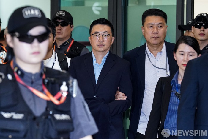 [영종도=뉴스핌] 정일구 기자 = 김건희 여사 일가의 '집사'로 알려진 김예성 씨가 12일 오후 인천국제공항 제1여객터미널을 통해 귀국해 김건희 특검팀(민중기 특별검사)에 체포된 뒤 입국장을 나서고 있다. 2025.08.12 mironj19@newspim.com