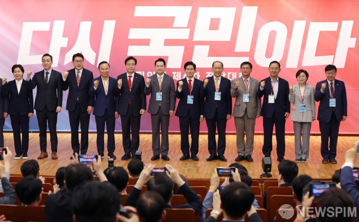 [서울=뉴스핌] 윤창빈 기자 = 국민의힘 당 대표 결선에 오른 장동혁·김문수 후보가 26일 서울 여의도 국회도서관에서 열린 국민의힘 제6차 전당대회 결선에서 송언석 비상대책위원장 겸 원내대표를 비롯한 당 지도부와 함께 파이팅 구호를 외치고 있다. 2025.08.26 pangbin@newspim.com