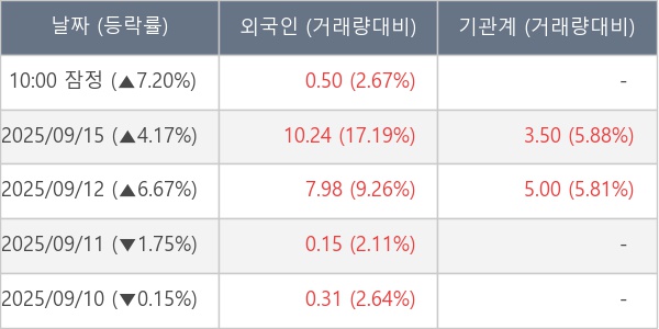 [서울=뉴스핌] 로보뉴스 = 16일 10시 15분 현재 영우디에스피(143540)는 전일 대비 7.20% (현재가 804원) 상승했고, 외국인이 최근 5일 연속 순매수(누적 19.17만 주, 잠정) 행진을 하고 있다.