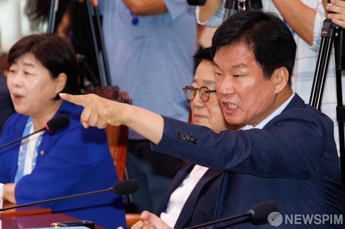[서울=뉴스핌] 윤창빈 기자 = 박균택 더불어민주당 의원이 16일 오전 서울 여의도 국회에서 열린 법제사법위원회 전체회의에서 곽규택 국민의힘 의원 발언에 항의하고 있다. 2025.09.16 pangbin@newspim.com