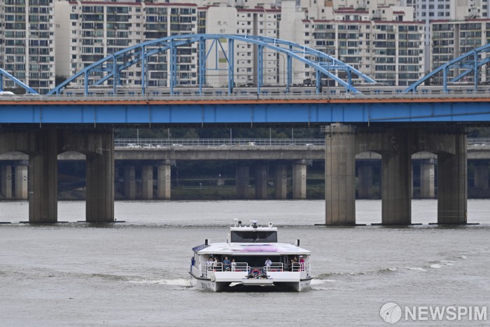 [서울=뉴스핌] 류기찬 기자 = 오세훈 서울시장이 탑승한 한강버스가 18일 오전 서울 서초구 잠수교 인근을 통과하고 있다. 2025.09.18 ryuchan0925@newspim.com