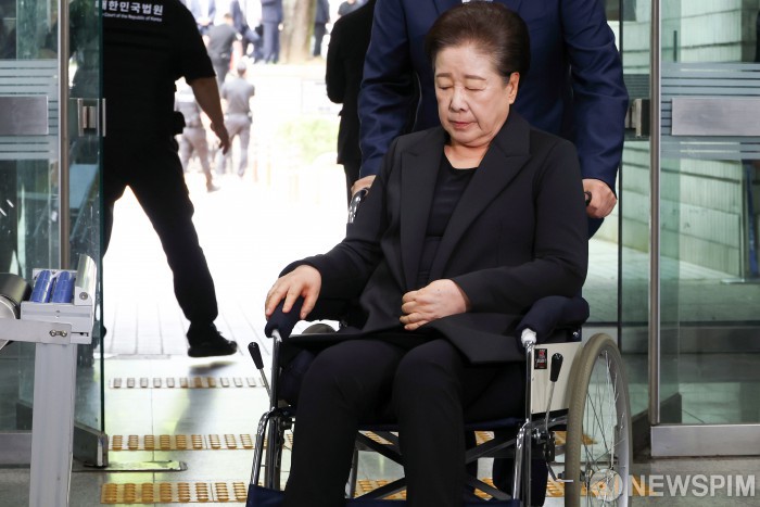 [서울=뉴스핌] 최지환 기자 = 청탁금지법과 정치자금법 위반 등 혐의를 받는 한학자 통일교 총재가 22일 오후 서울 서초구 서울중앙지방법원에서 열린 영장실질심사(구속 전 피의자 심문)에 출석하고 있다. 2025.09.22 choipix16@newspim.com